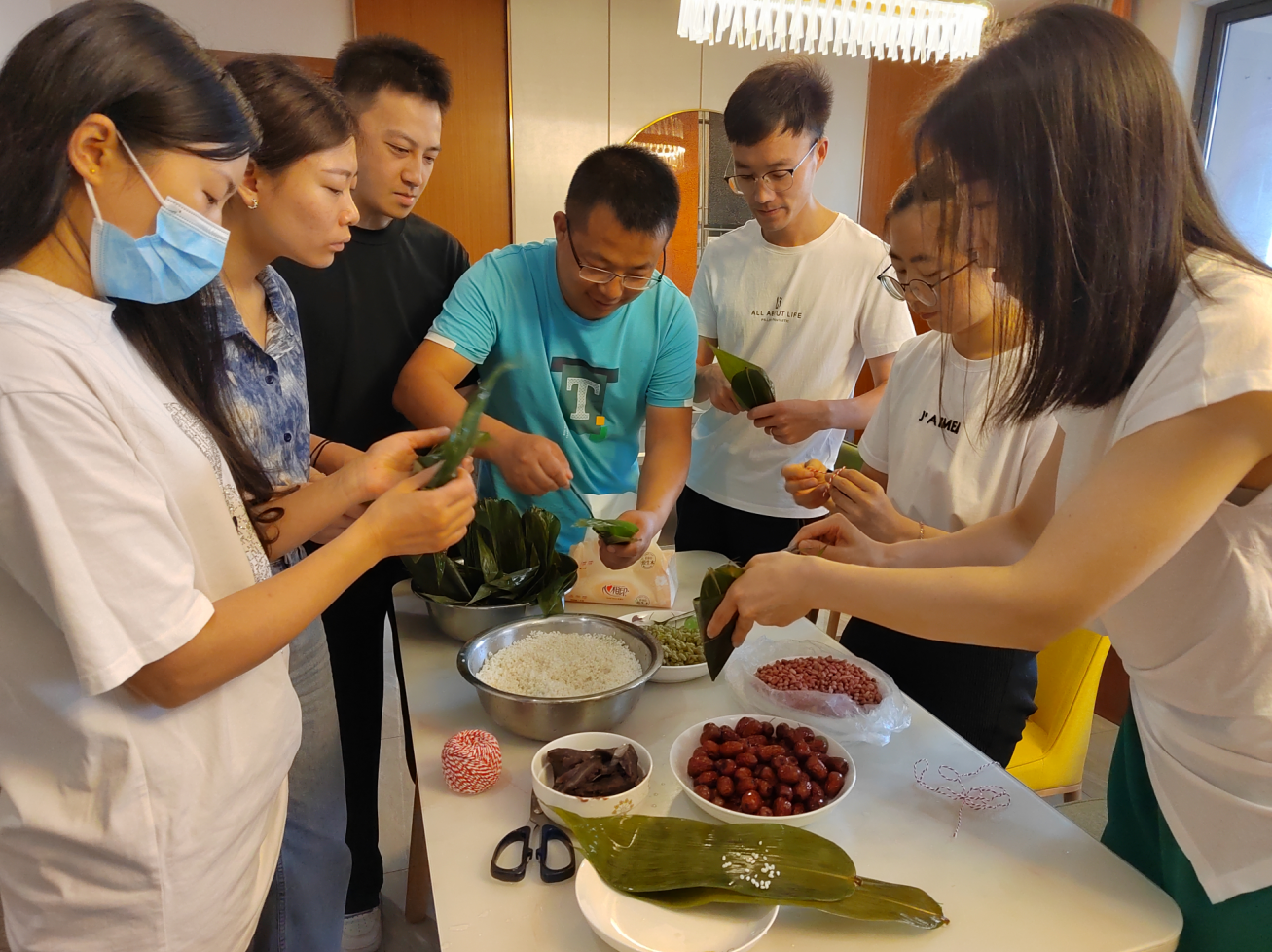 成都公司早早為大家準備好了粽葉、糯米、大棗、紅豆、葡萄干等材料,成都公司全體職工在一起用著不同的方法包著粽子,現(xiàn)場歡聲笑語、其樂融融,洋溢著端午節(jié)的熱鬧氣氛。卷葉、裹線、綁繩,大家忙得不亦樂乎,展示著自己的拿手技術(shù),三角粽,四角粽,牛角粽各種各樣,甚是好看,很快一盆盆的粽子就出現(xiàn)在大家面前。