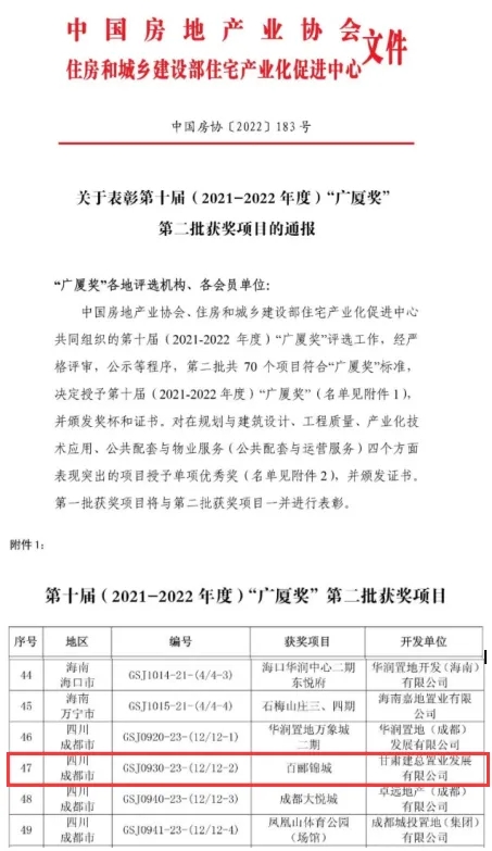 近日,由甘肅建總置業(yè)發(fā)展有限公司成都公司開發(fā)建設(shè)的百酈錦城項(xiàng)目榮獲中國(guó)房地產(chǎn)業(yè)最高榮譽(yù)“廣廈獎(jiǎng)”。