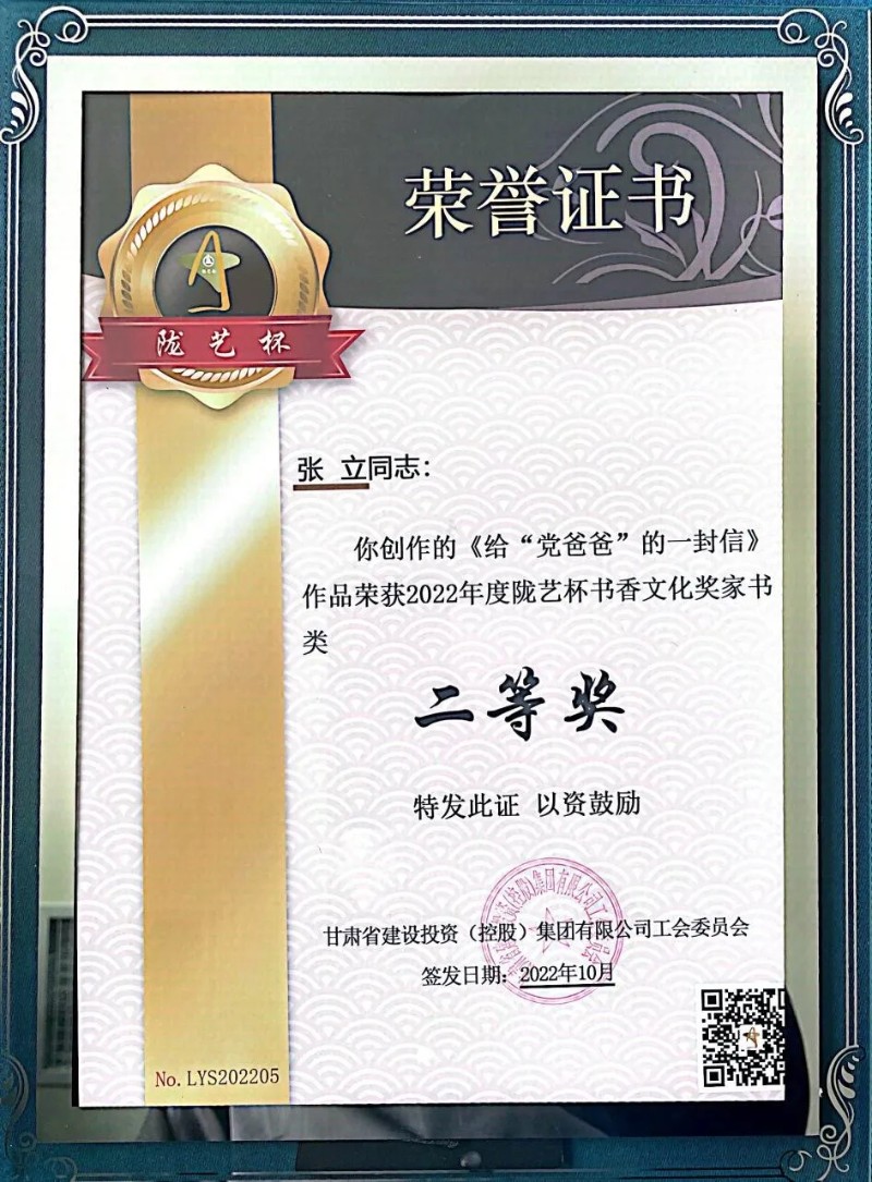 2022年,集團(tuán)公司工會(huì)以“書香滿庭芳 奮斗新征程”為主題,組織開展了“隴藝杯”書香文化活動(dòng),經(jīng)集團(tuán)公司組織評(píng)審,置業(yè)公司天水分公司職工張立的作品《給“黨爸爸”的一封信》榮獲家書類作品二等獎(jiǎng)。