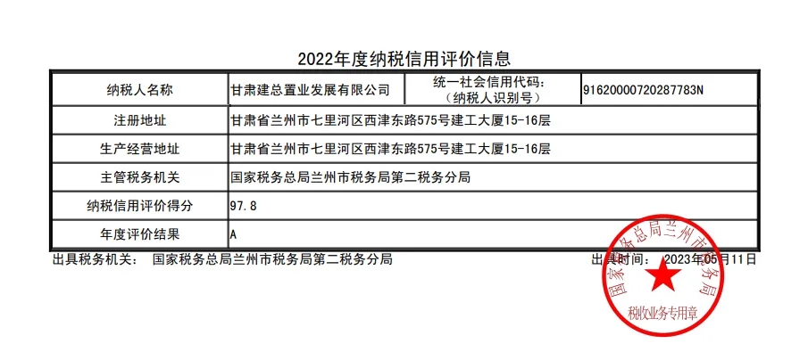 近日,在國家稅務(wù)總局甘肅省稅務(wù)局開展的2022年度納稅信用等級評定工作中,甘肅建總置業(yè)發(fā)展有限公司獲評“甘肅稅務(wù)系統(tǒng)納稅信用A級納稅人”榮譽(yù)稱號。此次獲評是置業(yè)公司首次榮獲該榮譽(yù)稱號,為公司融資、審計等業(yè)務(wù)提供了良好的信譽(yù)保證,進(jìn)一步提升了企業(yè)軟實力。