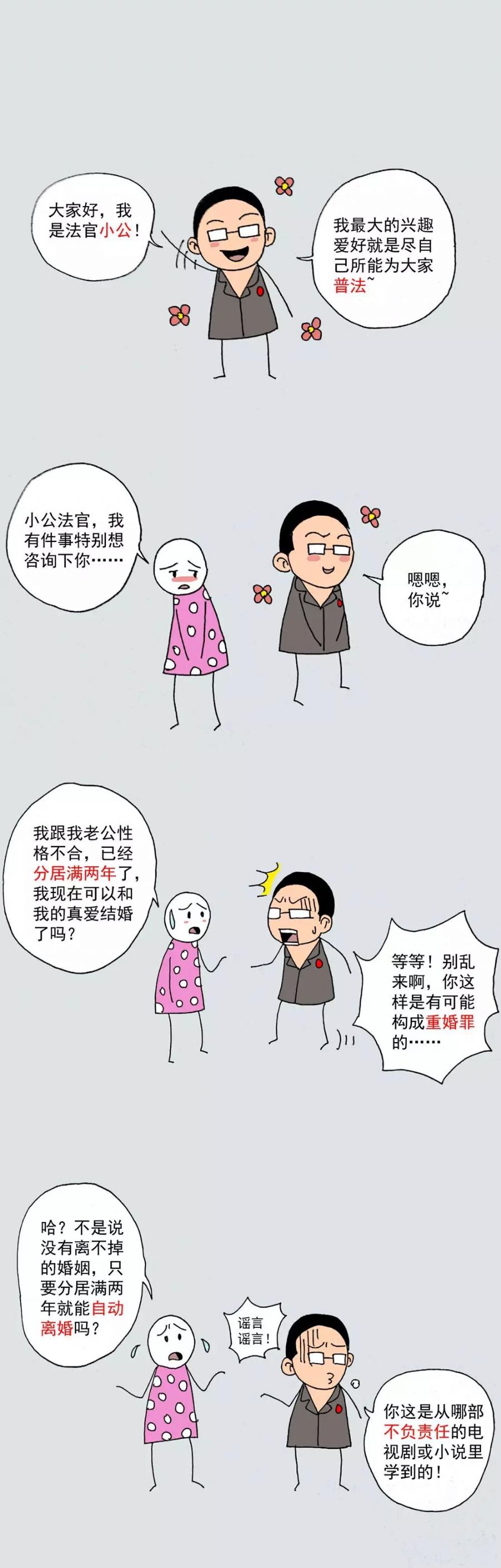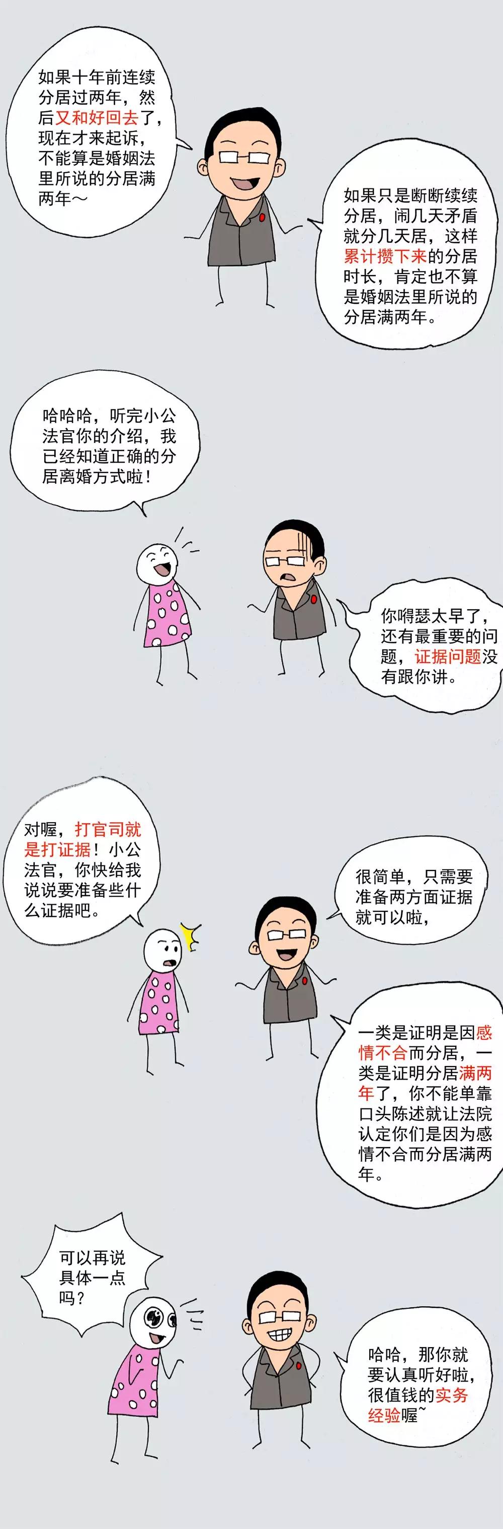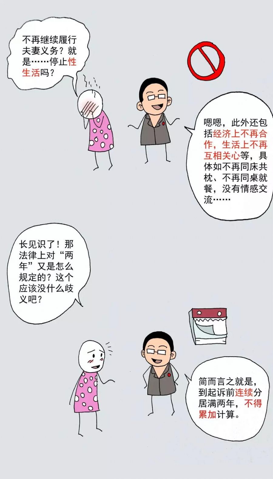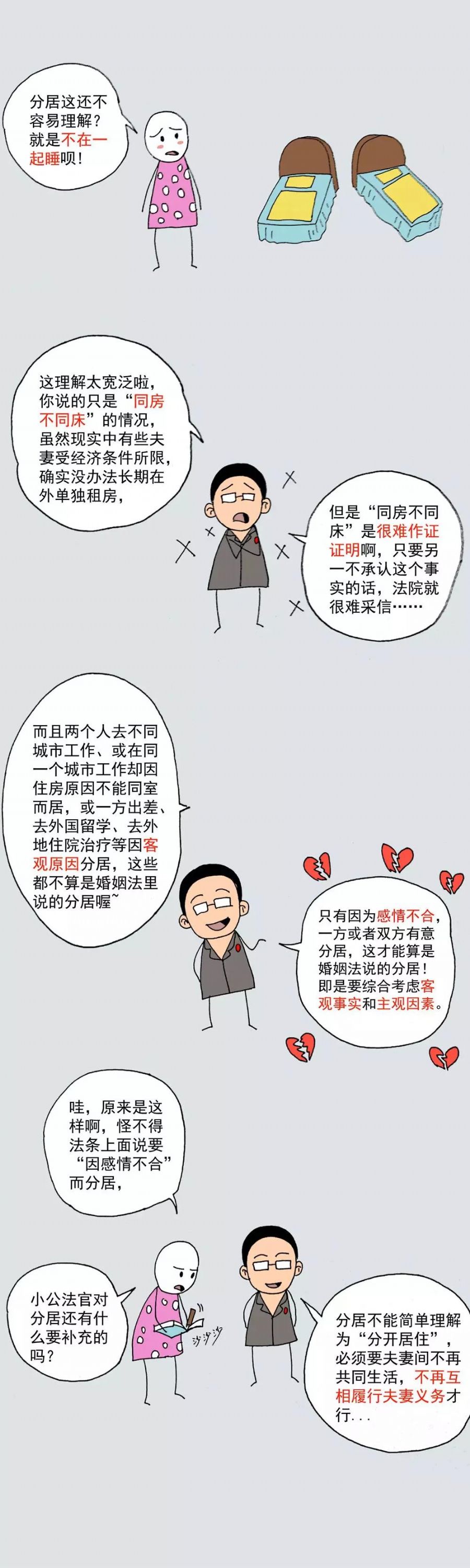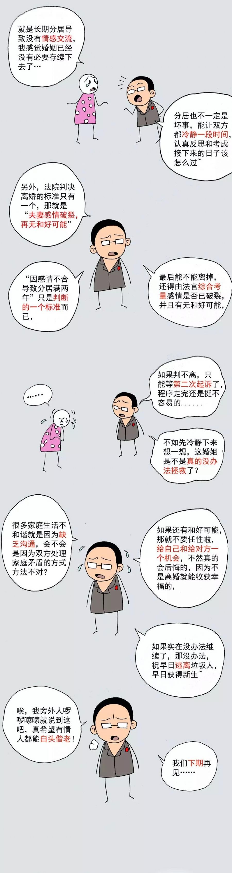 7.因感情不和分居已滿3年,確無(wú)和好可能的,或者經(jīng)人民法院判決不準(zhǔn)離婚后又分居滿1年,互不履行夫妻義務(wù)的。